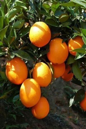 脐橙,芸香科柑橘属常绿小乔木植物,树枝少刺;叶片具芳香味,叶柄实际上是两片退化的小叶;花瓣为长圆形,白色,背面带淡紫红色;果实为球形、扁球形或椭圆形,橙黄至橙红色;果皮不易剥离,果肉味甜或酸甜,籽有少有多;花期3—5月,果期10—12月,晚熟品种至翌年2—4月。因开裂的顶部形同脐眼,故得名“脐橙”。